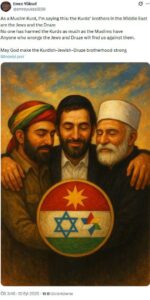“Bir Müslüman Kürt olarak şunu söylüyorum: Kürtlerin Ortadoğu’daki kardeşleri Yahudiler ve Dürzilerdir. Hiç kimse Kürtlere Müslümanlar kadar zarar vermedi. Yahudilere ve Dürzilere yanlış yapan karşısında bizi bulur. Tanrı Kürt-Yahudi-Dürzi kardeşliğini güçlü kılsın.”