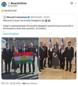 Ayrıca, “Mossad Commentary” gibi İsrail istihbaratına yakın hesapların içerikleri bu ağ tarafından anında dolaşıma sokuluyor. “Reşo Kurdistan” isimli bir hesabın, Knesset’te (İsrail Meclisi) gerçekleştiği iddia edilen bir görüşmeyi, “Kürt delegasyonu ve Dürzi topluluğu İsrail meclisinde, bu sembolik değil tarihi bir an” ifadeleriyle pazarladığı tespit edildi.