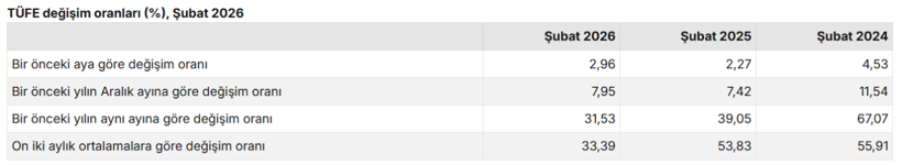 2025=100 bazlı endekse göre TÜFE; bir önceki aya kıyasla yüzde 2,96, yılın başına göre (Aralık 2025’e göre) yüzde 7,95 ve geçen yılın aynı ayına göre yüzde 31,53 artış gösterdi.