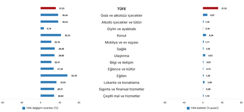 En yüksek ağırlığa sahip üç ana harcama grubunda yıllık artışlar dikkat çekti. Konut, su, elektrik, gaz ve diğer yakıtlar yüzde 42,33, gıda ve alkolsüz içecekler yüzde 36,44, ulaştırma ise yüzde 28,86 yıllık artış gerçekleşti.