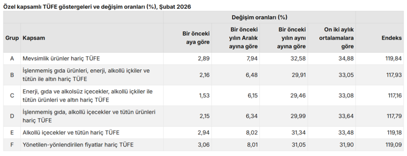 İşlenmemiş gıda, enerji, alkollü içkiler, tütün ve altın hariç hesaplanan özel kapsamlı TÜFE göstergesi (B) ise yıllık yüzde 29,91, aylık yüzde 2,16 arttı.