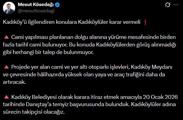 Kararın ardından Kadıköy Belediye Başkanı Mesut Kösedağı’ndan dikkat çeken bir açıklama geldi. Kösedağı, Kadıköy’ü ilgilendiren konularda Kadıköylülerin söz sahibi olması gerektiğini vurgulayarak, cami yapılması planlanan dolgu alanına yürüme mesafesinde birden fazla tarihî caminin bulunduğunu hatırlattı.