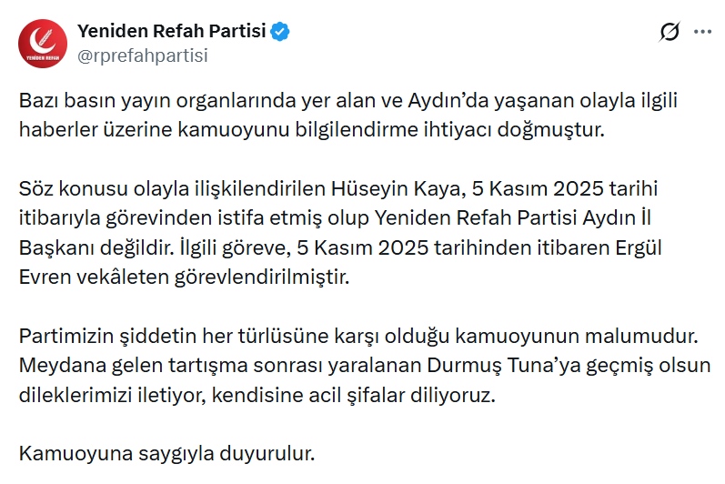 Yeniden Refah Partisi Genel Merkezi tarafından sosyal medyadan yapılan yazılı açıklamada, “Söz konusu olayla ilişkilendirilen Hüseyin Kaya, 5 Kasım 2025 tarihi itibarıyla görevinden istifa etmiş olup Yeniden Refah Partisi Aydın İl Başkanı değildir” ifadelerine yer verildi.