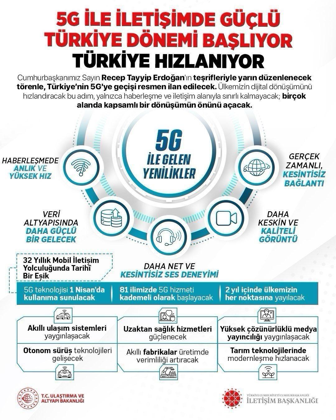 İletişim Başkanı Duran, sanal medya hesabından yaptığı açıklamada, “Cumhurbaşkanımız Sayın Recep Tayyip Erdoğan’ın teşrifleriyle gerçekleşecek törenle, Türkiye yarın 5G teknolojisine geçiş sürecini başlatıyor; Türkiye hızlanıyor. Bu adım, iletişim altyapısında yeni bir safhaya işaret ederken, aynı zamanda stratejik kapasitenin güçlendirilmesi açısından büyük önem taşımaktadır. Cumhurbaşkanımızın liderliğinde şekillenen Türkiye Yüzyılı vizyonu, iletişim alanında güçlü, güvenli ve bağımsız bir yapının inşasını öncelikli hale getirmektedir. Bu kapsamda 5G, bilginin hızlı, güvenli ve kesintisiz dolaşımını mümkün kılan temel bir altyapı olarak öne çıkmaktadır” dedi.